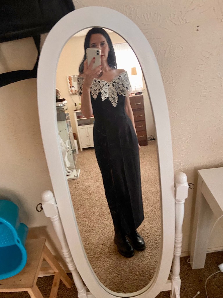 I got this 1990’s-era Victoria’s Secret poet shirt from eBay. It’s amazing. Makes me feel like I’m in a 90’s music video (Celine Dion or Meatloaf).My Jessica McClintock dress for the Birthday Massacre concert. I got compliments on the dress, but it was a little uncomfortable, being tight. Hard to sit down. However, there was no sitting down during the concert. I was also grateful for my Doc Martens, which kept my feet comfortable. I polished them before the concert, and they look like new again. My two-toned hair, ugh. I’m trying to persevere and grow out the indigo, but it’s hard. I’m also in fits over the awful layers, which can’t be seen in this photo. I’m thinking about just enjoying the length this summer, finally having long hair again, then cut it as short as I can stand for the fall. That will eliminate more indigo portions and some of the layering.