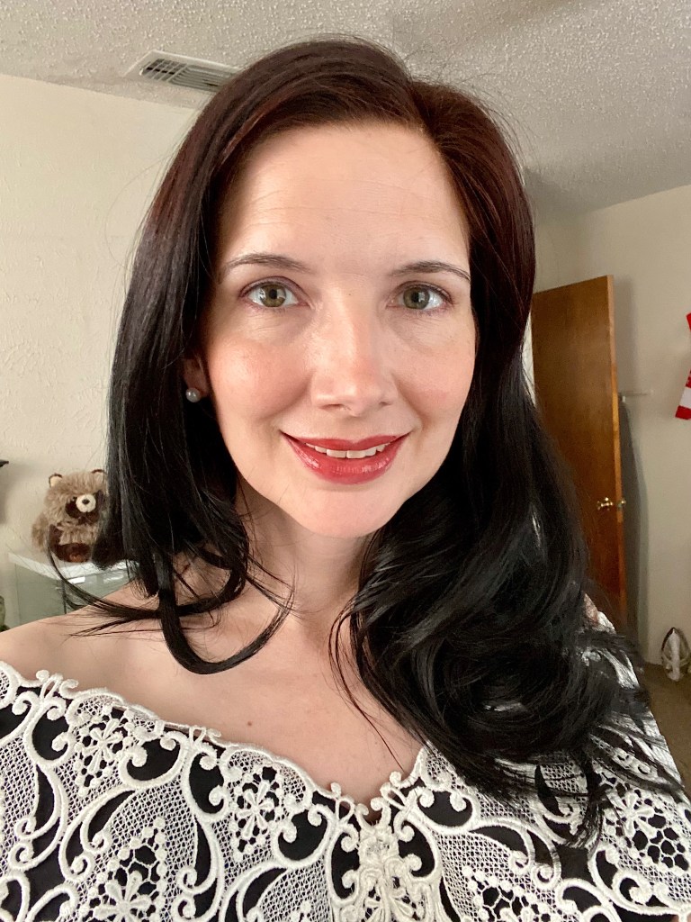 I studied 80’s and 90’s makeup this week not only to try to get my look right for the show but also to plan for our vacation. I found an old prom photo with a dress much like this one. The girl was wearing purple eyeshadow and red lipstick, so I went with that. However, I can’t see the purple eyeshadow. All the same, I like it.
